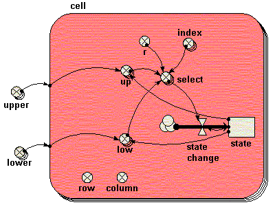In the present implementation, these lower and upper values are represented in two 3x3 arrays, held in the variables lower and upper respectively. Within the grid cell submodel, one row from these two arrays is selected, according to the current state of that cell. This is then compared with a random number r to determine the new state. This is then used to engineer an appropriate value for the flow causing a change in the state compartment.